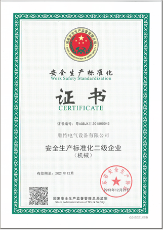 根据顺安监2017【79】号文件"佛山市顺德区安全生产监督管理局关于全面推进安全生产标准化建设的实施意见”以及我公司客户审核的需要,安委会从2017年11月开始组织进行安全生产标准化的创建工作。由安委会为主导,各生产部门紧密配合,分别以安全生产责任制、职业安全健康、事故管理、特种设备管理等88项标准与公司的安全生产状况进行逐一对照、整改及完善。通过一年的努力, 2018年11月29日,广东省安全生产监督管理局与广东省安全生产协会组织专家评审组对我公司进行了安全生产标准化验收评审。专家组从职业健康安全目标、组织机构和职责、安全生产投入等要素及企业达标标准内容进行考评,我公司考评分为94.9分(80分达标,100分为满分),达到了工贸企业安全生产标准化二级标准。经过广东省安全生产监督管理局进一步审核确定,2019年2月21日向我司颁发了“安全生产标准化二级企业”证书和牌匾,证书有效期三年,每三年复审。