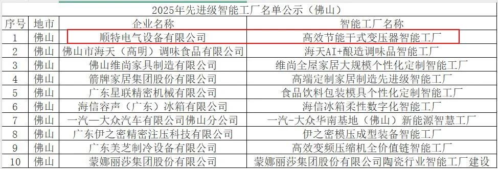 近日,广东省工业和信息化厅公布“2025年先进级智能工厂”名单,Ebpay电气“高效节能干式变压器智能工厂”凭借融入绿色低碳可持续发展理念的智能化生产体系、信息化管理水平成功入选该名单,成为佛山市10家上榜企业之一。这一权威评定聚焦企业在工厂建设、数字化转型、网络化协同建设等多维度的综合表现,是对Ebpay电气三十余年深耕输配电领域、坚定推进智能制造转型升级的权威认可。